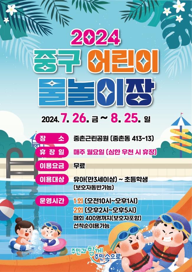 각구에서 만 13세 이하 어린이들의 건강과 즐거운 여름 나기를 위해 무료로 물놀이장을 개장합니다.