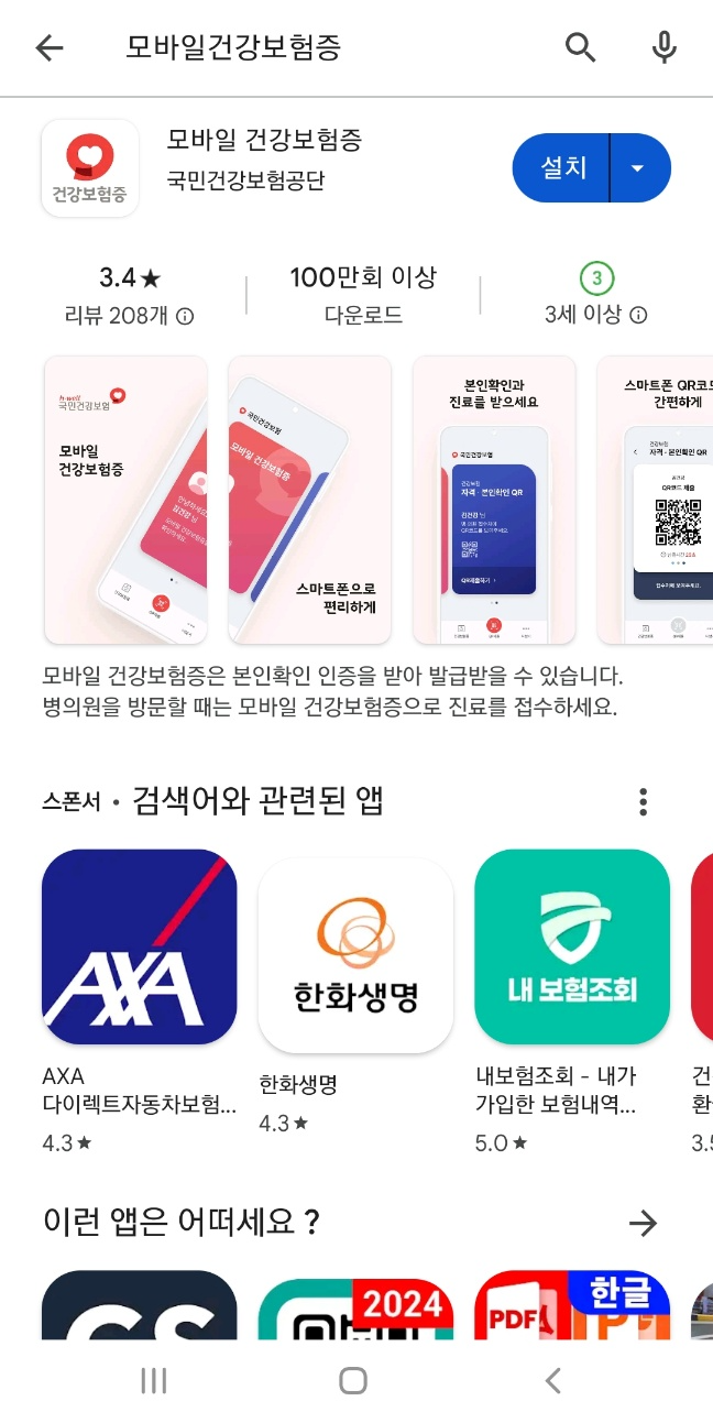 플레이스토어 앱 → 모바일건강보험증 설치 → 본인확인 → 발급