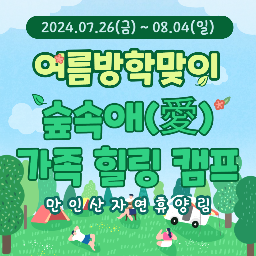 대전시 공원관리사업소에서 7월 26일부터 8월 4일까지 만인산자연휴양림에서 초등학생 가족을 대상으로 '여름방학맞이 1박 2일 숲속애 가족 힐링캠프'를 개최합니다.